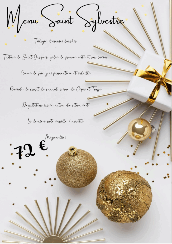 Saint Sylvestre 2025 Ce menu est uniquement proposé le soir du 31 Décembre .Un acompte par personne vous sera demandé pour confirmation de la table.Il est également possible en version à emporter au tarif de 65 € par personne. Acompte pour personne